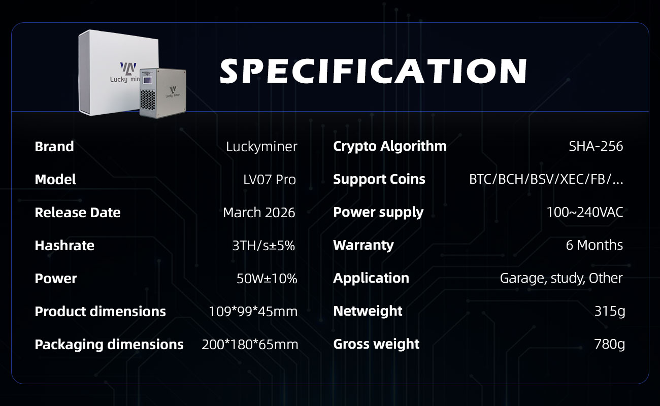 The LuckyMiner LV07 Pro is a next-generation compact ASIC miner designed for home users and small-scale mining enthusiasts. With a balance of stable hashrate, ultra-low power consumption, and plug-and-play convenience, it brings professional mining performance into everyday environments like your garage, study, or office.
